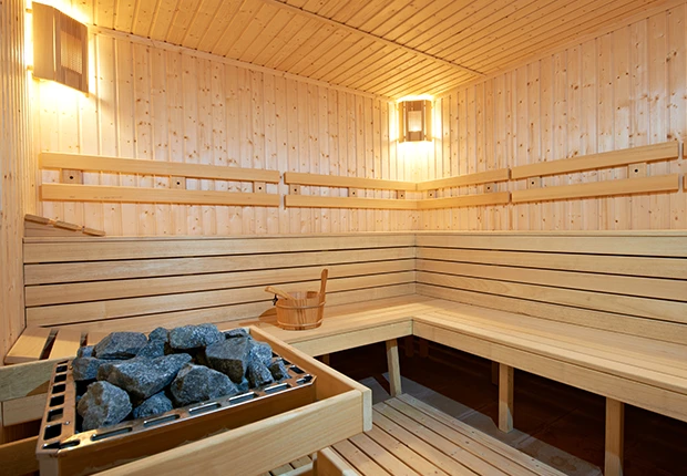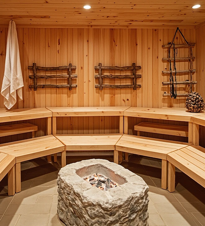 Le sauna finlandais reste l’élément central de l’expérience de chaleur. Construit en bois, il offre une chaleur sèche et intense, produite par un poêle chauffant des pierres volcaniques. L’humidité y est faible, sauf lors du traditionnel “löyly”, où de l’eau jetée sur les pierres brûlantes génère une bouffée de vapeur dense et brève.